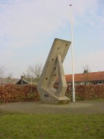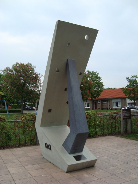 De sculptuur staat symbool voor het verzet dat het kapotte land overeind houdt: de steunpilaar is klein en draagt het geschonden grote vlak.