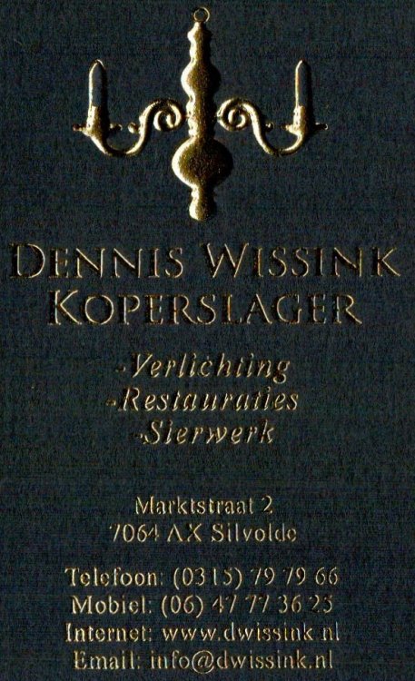 Ambachtelijk koperslager Dennis Wissink is specialist voor verlichting, reparatie en sierwerk. Het werken met metaal zit in de genen van Dennis Wissink. Zijn vader was gereedschapsmaker en koperslager, zijn grootvader werkte bij de technische dienst van de DRU en zijn overgrootvader was ‘Smids Toon’, die in 1800 een smederij begon in de Kroezenhoek. Hij heeft het vak van koperslager mede geleerd van zijn vader, die een grote werkplaats heeft bij zijn woning in Voorst. Van jongs af aan was Dennis in de werkplaats te vinden. Dennis studeerde werktuigbouwkunde aan het Graafschap college.