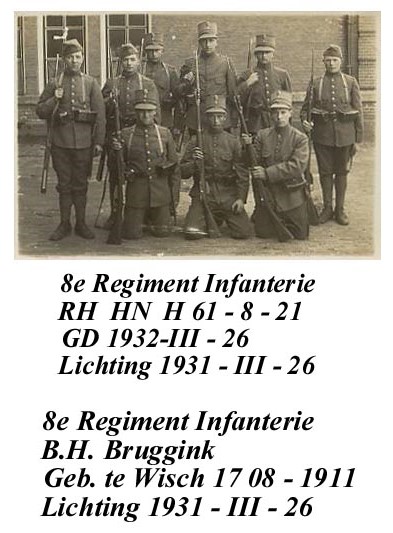 Op de foto van het 8e Regiment Infanterie staat Jan Tiedink helemaal links en tweede van links is mijn vader Hendrik Bruggink. Het 8e Regiment was gelegerd in de Saksen Weimar kazerne in Arnhem.