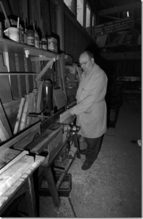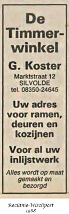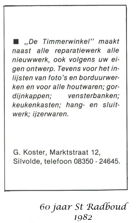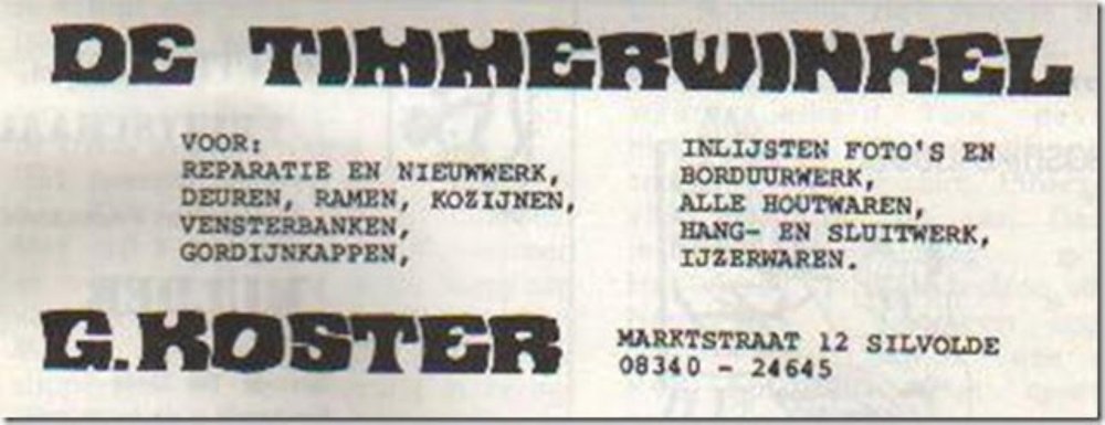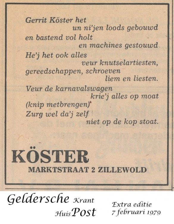‘t Sillevolds timmerwinkeltje A’k vrogger veur school in de handenarbeidles of veur mien eiges thuus wat neudeg had op holtgebied raej ik altied efkes naor markstraot 12 in Sillevold. Door was het timmerwinkeltje en de werkplaats van Gert Koster, iemand met twee golden handen. In zien zaak ko’j terech veur het inliesten van schilderi-jkes of borduurwerk, maor ok veur het maken van complete raamkozienen en bevobbeld holten vensterbanken of deuren. Ik heb heel völ van Gert geleerd en kon alle - jekes goed met ‘m opschieten. Hi-j was het toonbeeld van geduld en i-j konnen het niet zo gek bedenken of hi-j had ter een oplossing veur. Ik praot now aover de tied van lang veur de Gamma. Bi-j Gert zag ik veur het eers een verstekma - chine woormet i-j deur der met de vuut op te traejen deur een stuk holt hen konnen douwen um twee vliemscherpe hoeken van 45 graden te maken veur bevobbeld schilderi-jlieskes. Gert zagen alles veur ow op maot en a’j een klein stukske holt neudeg had, zei e vaak: ‘Och ’t is maor zo’n ströppeltje. Doe maor twee kwatjes.’ Op de foto’s kö’j zien dat der heel wat ’ströppeltjes’ her en der in de werkplaats stonnen. Later wed dén uutge - breid met een grote loods zodat Gert ok met umvangriekere opdrachten uut de vuut kon. In het winkeltje was van alles te koop op het gebied van ie - zerwaren, hangen sluutwerk, draodnaegels en holtschroe - ven in alle denkbore maoten. Liemklemmen, knieptangen, schroevendraejers, hamers en wa’j wiejers allemaol kön bedenken veur het bewerken van holt. Het kleine grei wed veur ow afgewaogen en in een tuutje vepakt. Ad - vies kreg i-j der gratis en veur niks bi-j. In de winkel gaf een schoefdeurke toegang töt zien kantoortje en net as in de werkplaats was het ok door een gezellege bende. Gelukkeg he’k ooit veur het tweede lustrumboek van het Isala een foto van Gert en van zien handel motten maken. Deurum kö’j van die Sillevoldse historie hierbi-j ok beelden bekie - ken. Veur biezundere vehalen ko’j ok goed terech bi-j de vriende - leke doe-het-zelf-winkelier. Zo vernam ik dat der ooit een vader met een klein kind in de werkplaats was gekommen en dat jungsken wol met de hendjes in de draejende vandiktebank griepen. Gert kon het keerltje nog net an de kant douwen anders was ter een vreselek ongeluk gebeurd. ‘Och, dan had e ’t van eiges af - geleerd,’ was het commentaar van zien niet al te snuggere vader. Ooit had de timmerman een knechjen of stagiair in diens en den wol iets afzagen met de cirkelzaagmachine onderwiel hi-j het holt an de vekeerde kant wol invoeren. ‘Niet te geleuven wat ze tegeswoordeg nog leren op school’ was het idee van Gert. Het was toen bliekboor al lastig um an goed ge - kwalificeerd personeel te kommen. As vader ’s zondags met vrouw en kinder een end gong ri-jen, mochen ze eiges zeggen woorhen. Hoe wied dat was, miek ok niet uut, maor dan mossen de kinder wel precies zeg - gen hoe hi-j ri-jen mos. Volges mien hadden ze dat thuus van te veuren allemaol op de kaat uut motten zuken. Dat opvoeden gong dus hand in hand met leren en ze zult gegarandeerd baeter zun in topografie as ik. Een van de dochters is niet veur niks aardrijkskundedocent gewodden. Een ander vehaaltje gong aover zien dochter die in de eerste klas van de laegere school niet van de juffrouw wol annemmen dat ‘God’ met een ‘d’ geschreven mos wodden. De juf lei uut dat het meervoud van god, goden is, maor volges het kleine deerntje kloppen dat niet: ‘der is maor één Got’, dus mos i-j dat met ’n ’t’ schrieven! Ok eur he’k nog in de klas gehad, maor of ze op die laeftied nog an ‘Got’ geleuven wet ik niet meer. Dat geleuven ston trouwes op het Isala niet zo hoog in het vaandel. Een van de Sillevold - se industriëlen in het schoolbestuur kreg het ooit in de kop um van de leraren een veklo - ring te willen afdwingen dat die allemaol ech katteliek wazzen. Is niet deurgegaon. Gelukkeg maor, want dan hadden ze toen de school waeges gebrek an leraren geliek kön - nen sluten. Het smalle winkelgebouwtje steet ter nog steeds en ok de loods derachter woor vrog - ger de werkplaats was. Eersdaags toch ’s vraogen of ik mag kieken hoe ze door een bewoonbaar huus van gemaak hebben.