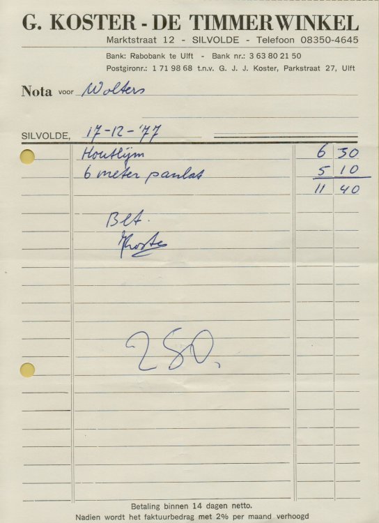 Charles Giesen over Timmerwinkel Koster, voor een gulden een zakje spijkers halen, die werden afgewogen en het hout voor de hut zaagde deze vriendelijke man altijd gratis op maat.