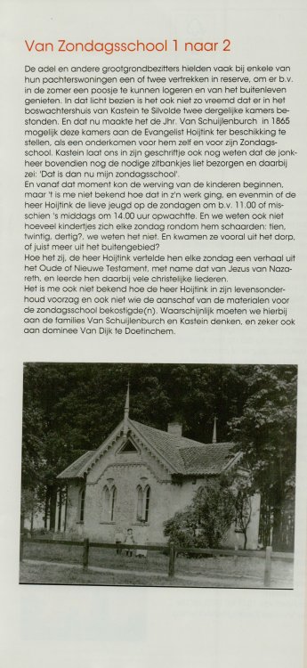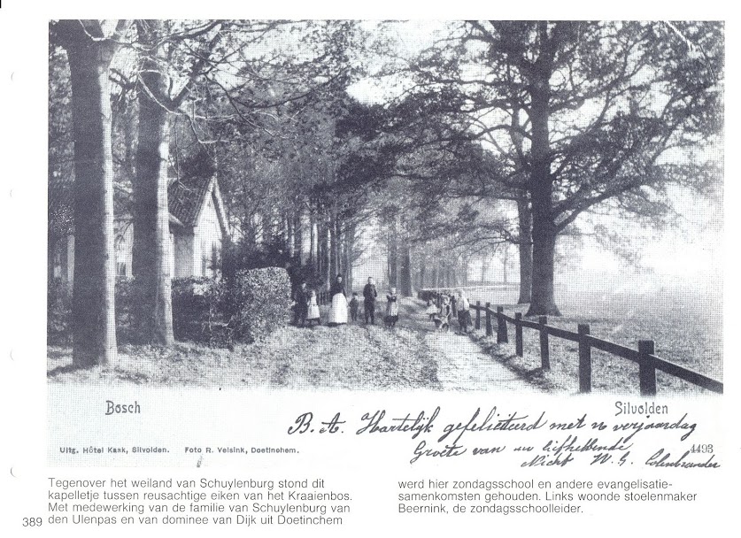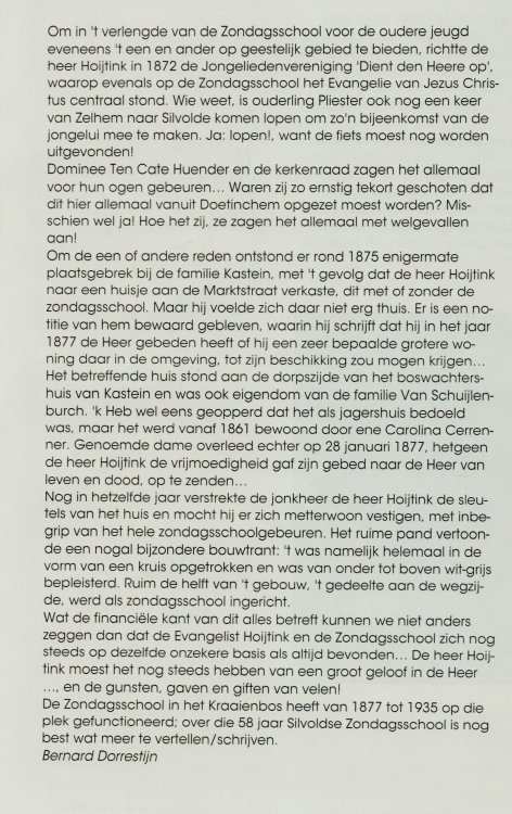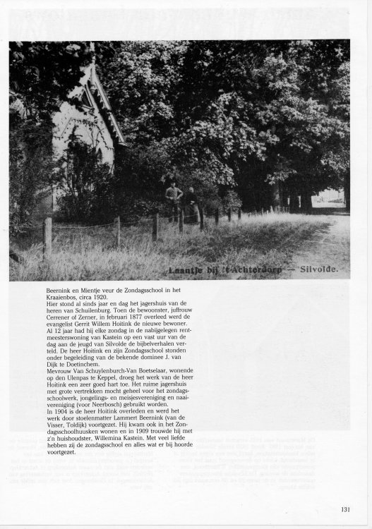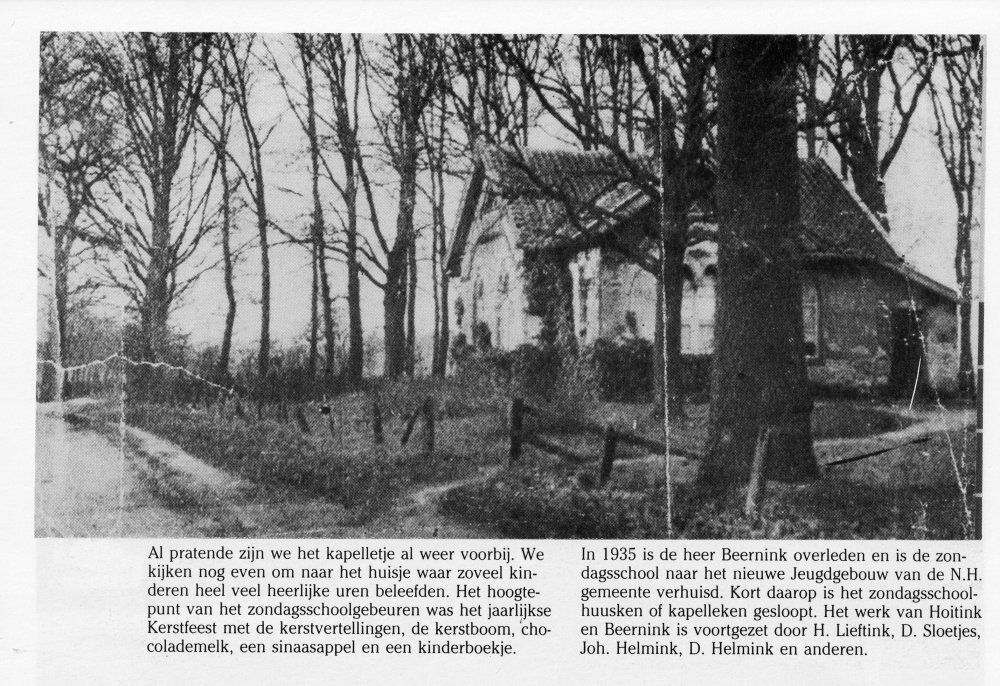 Afscheid van Mientjen en Lammert In 1865 startte de heer Hoijtink in het huis van boswachter Kastein de Silvoldse Zondagsschool. De kleine Wilhelmina Christina was ongeveer vijf jaar. En vanaf dat vroege moment zou ze haar hele verdere leven met diezelfde Zondagsschool verweven blijven. Eerst al bij haar thuis en vervolgens als medewerkster en tevens als dienstbode/huishoudster van de heer Hoijtink in 't Kapelletje in 't Bos. En daar draaide ze dan mee met de Zondagsschool, Jongeliedenvereniging, Zangvereniging, Naaivereniging, Metworstenactie enz. Dit alles vanaf 1909 samen met haar trouwe echtgenoot en nieuwe Zondagsschoolleider Lammert Hendrikus Beernink uit Sinderen-Varsseveld. Dat alles hield maar liefst 17 jaar stand, maar op 28 februari 1926 overleed Wilhelmina Christina Beernink-Kastein in haar geliefde Kapelletje in 't Bos. Diep betreurd door Lammert en de vele vriendinnen en vrienden werd ze enkele dagen daarna vanuit ‘t Kapelletje naar haar laatste rustplaats op de Hervormde Begraafplaats gedragen. Daar rijst thans nog onder de bruine beuk haar verticale grafsteen met o.a. een tekst uit de Hebreeënbrief, hoog op. Lammert Hendrikus Beernink bleef alleen over, maar zette het geheel van taken op de beproefde wijze voort, daarbij trouw bijgestaan door o.a. boer Hendrik Willem Lieftink van Harbers en de heer Johan Helmink te Silvolde. Na acht jaar, op 28 februari 1934, draagt Lammert Hendrikus Beernink de leiding van de Silvoldse Zondagsschool met een officiële verklaring over aan de genoemde heer Johan Herman Helmink. De heer Beernink blijft nog in 't Kapelletje wonen, maar tenslotte verhuist hij naar z'n familie te Varsseveld, alwaar hij op 17 maart 1935 het tijdelijke met het eeuwige verwisselt. De gelovigen, hun werken volgen hen na! 't Kapelletje in 't Bos staat er dan even leeg en verlaten bij ..., waarop rentmeester Welling er goed aan denkt te doen het maar gauw met de grond gelijk te maken. Maar gelukkig zijn we nog in het bezit van een aantal foto's en tekeningen en de maquette van de heer Ben Vriezen van de Bontebrug! De heer Johan Helmink verhuisde de Zondagsschool naar het juist gereed gekomen Jeugdgebouw bij de Hervormde kerk! Bernard Dorrestijn