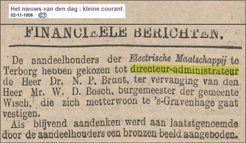 Terborg. De aanleg voor het electrisch licht is zoo goed als klaar en men wacht slechts op de voltooiing der machinerieën te Vulkaansoord, om met ‘t “nijje licht” den nacht in den dag te veranderen.