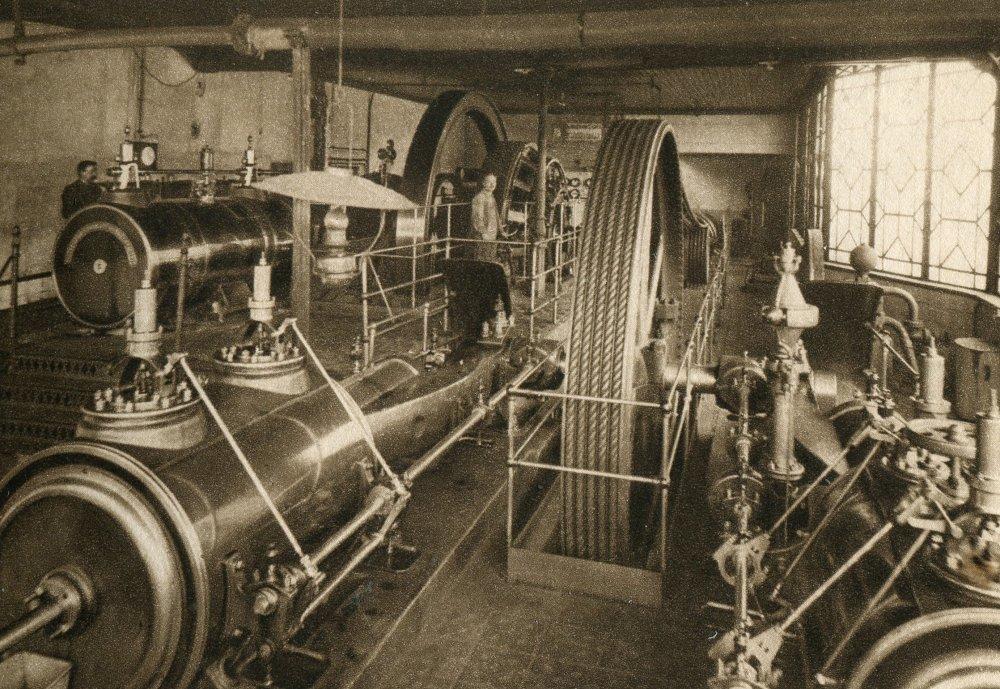 Een kijkje in de machinekamer bij Vulcaansoord in 1917, compleet met stoommachine en dynamo.