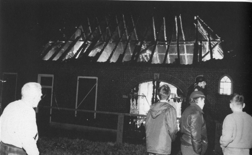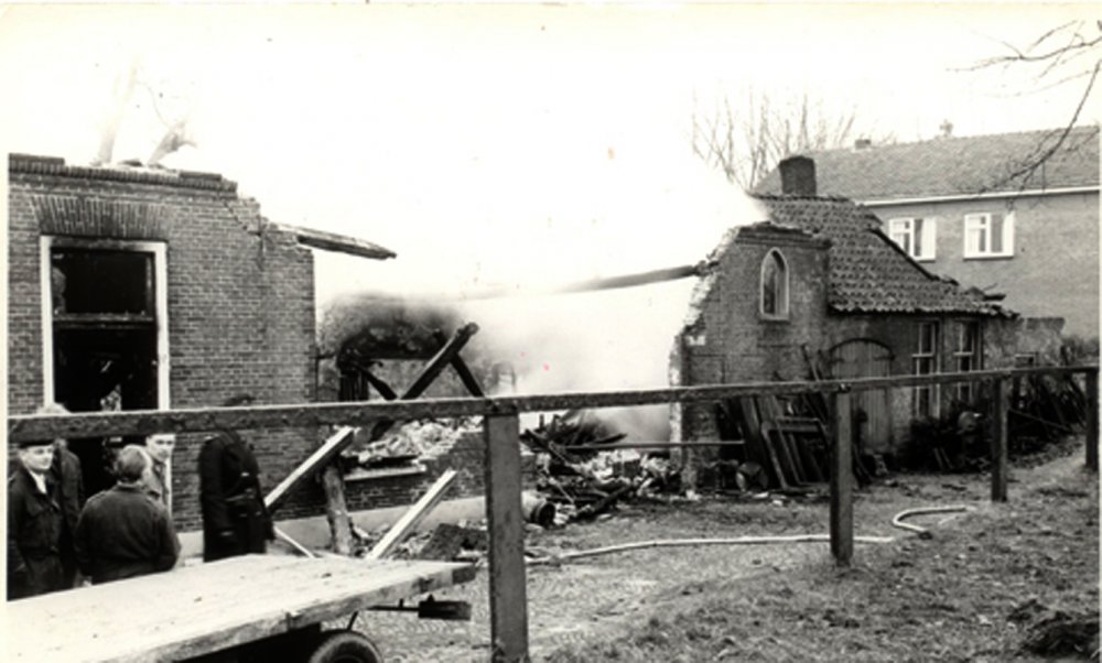 Het huis stond toen al volledig in brand. Ik had m’n vader wakker geschreeuwd en we zijn samen naar de brand gerend. Mijn moeder heeft de brandweer gebeld. Twee brandweermannen, o.a. overbuurman Hans ten Have en ? waren natuurlijk door de brandmelding sneller dan de brandweerauto aanwezig. Mijn vader Gert heeft Jan en en een zus uit het huis gehaald. Ik moest buiten blijven van m’n pa. De tweede zus kon hij niet vinden. Toen de brandweer kwam mocht m’n vader t huis niet meer in. Alles is afgebrand maar Jan en zijn zus waren veilig. Jan wilde nog wel terug alle kostbaarheden uit het huis halen, maar dat mocht natuurlijk niet meer van de brandweer. Jan huilde om zijn huis maar ook zeer zeker om zijn gouden horloge. Hij was bijna niet te houden om dat sieraad toch nog uit de vuurzee te halen dat op zijn nachtkastje achtergebleven was. Jan stond in zijn ondergoed buiten maar kreeg snel noodkleding van de buurt.