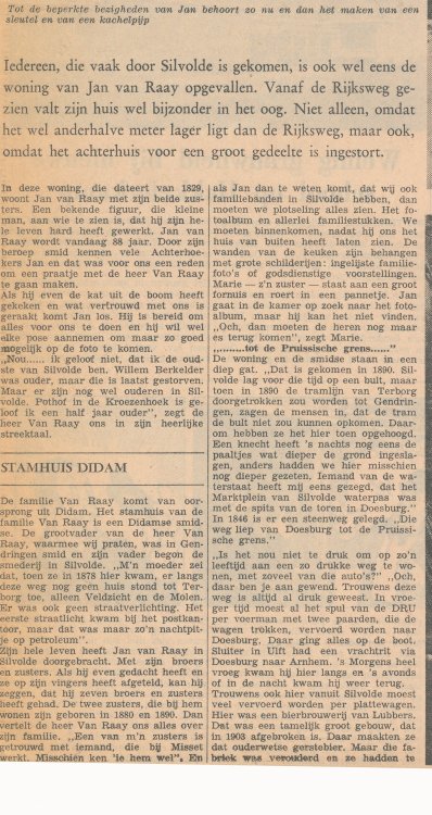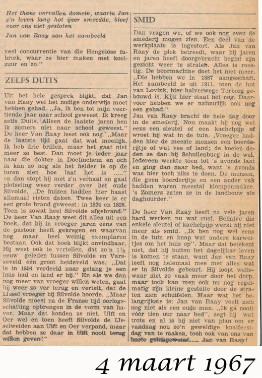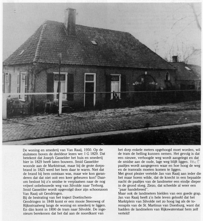 Komend van Silvolde (op weg naar het zwembad) maakte ik er altijd flink snelheid. Midden voor de smederij was een grote molensteen in geplaveid, die werd gebruikt om hoepels warm om karrenwielen te leggen; in het gat in het midden kwam de naaf. Als er niet gewerkt werd lag er op dat gat een ijzeren plaat. Mijn tante Doortje kwam een keer in het donker er achter dat de plaat er niet lag en maakte een onvrijwillige salto en een harde smak. Gelukkig kon Jan van Raai de fiets fatsoeneren.